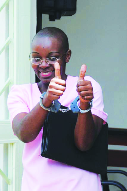 Victoire Ingabire, despite being in handcuffs for "genocide denial," gives a thumbs up to her supporters outside a Rwandan courtroom on April 17, 2012.