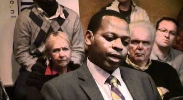 Lin Muyizere, husband of Rwandan political prisoner Victoire Ingabire, speaks to a Dutch journalist and audience after her 2010 arrest.