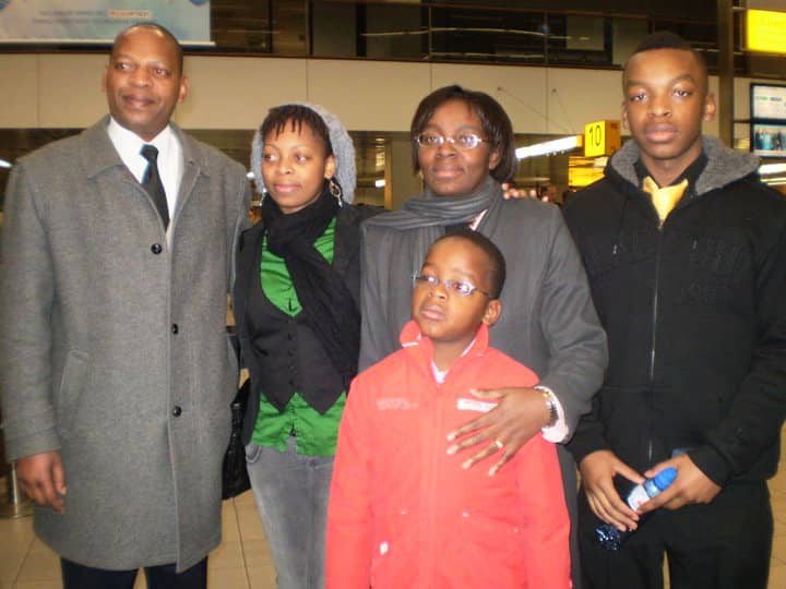 Victoire Ingabire's family at the airport before Victoire departed for Rwanda in January 2010: her husband Lin Muyizere, left, daughter Raissa Ujeneza, center left, Victoire, center right, son Remy Ndizeye Niyigena, right, and son Rizst Shima, front